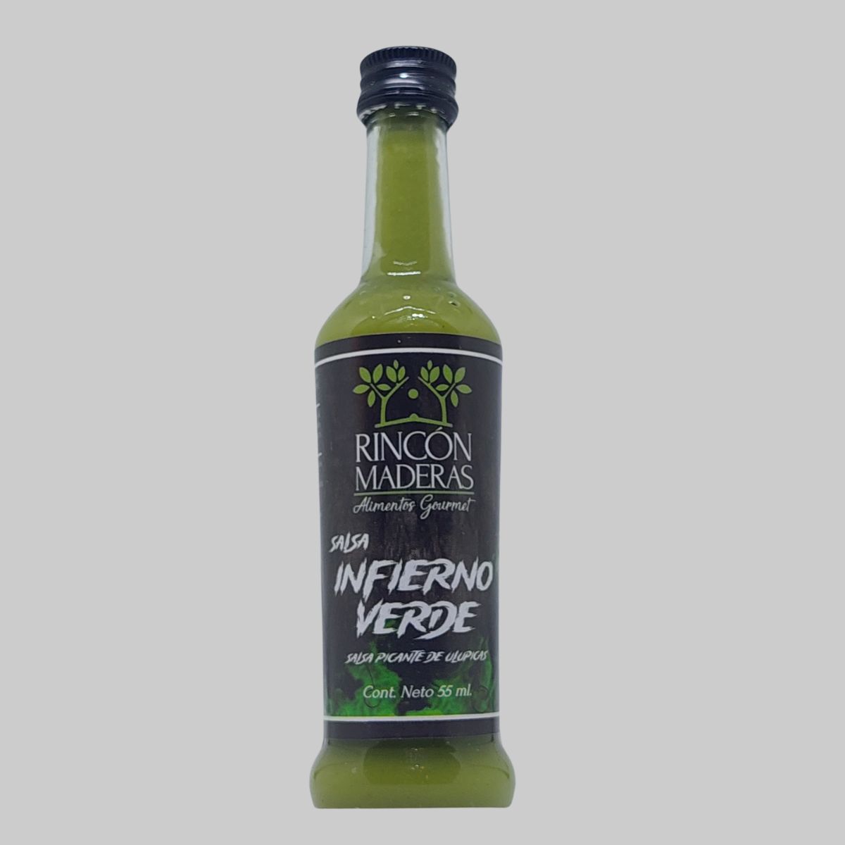 Salsa infierno verde en frasco de vidrio, 55 ml cada frasco.